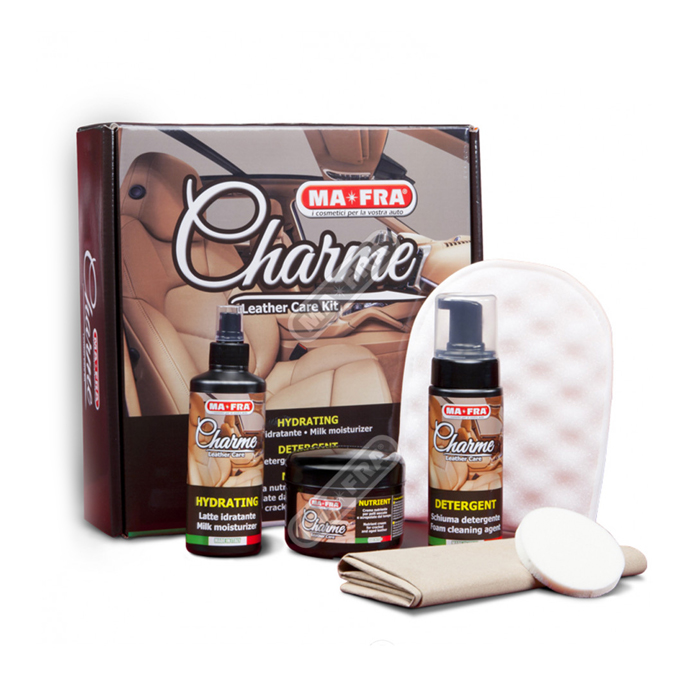 Ideal para limpar bancos e capas de couro e capas de assento, graças à sua tripla ação hidratante, de limpeza e nutritiva, o kit Charme devolve nova vida, esplendor e brilho a interiores e estofados de couro usado e desbotado.